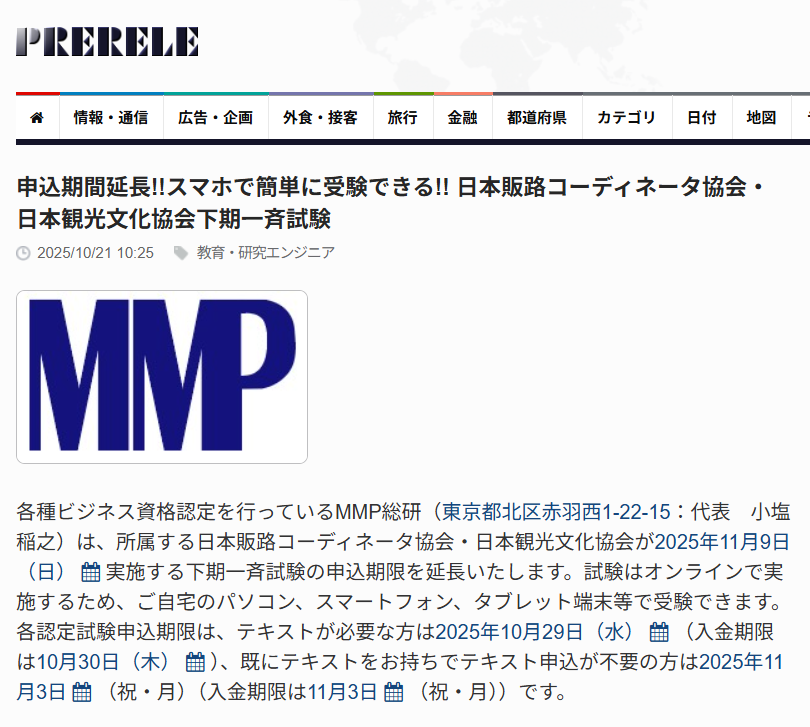 各種ビジネス資格認定を行っているMMP総研(東京都北区赤羽西1-22-15:代表 小塩稲之)は、所属する日本販路コーディネータ協会・日本観光文化協会が2025年11月9日(日)実施する下期一斉試験の申込期限を延長いたします。試験はオンラインで実施するため、ご自宅のパソコン、スマートフォン、タブレット端末等で受験できます。各認定試験申込期限は、テキストが必要な方は2025年10月29日(水)(入金期限は10月30日(木))、既にテキストをお持ちでテキスト申込が不要の方は2025年11月3日(祝・月)(入金期限は11月3日(祝・月))です。
