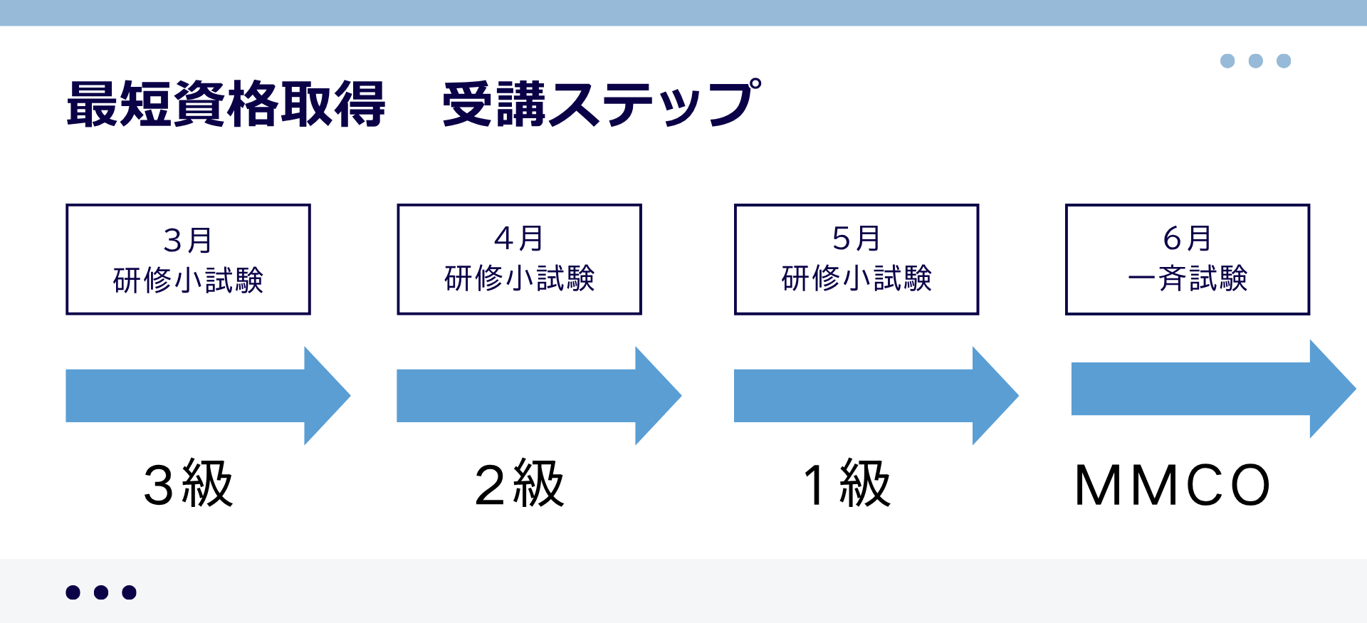 ※3級資格認定研修プログラムでの小試験合格後の資格登録料(初回のみ)および年間登録(年度ごとの更新)は含まれていません。